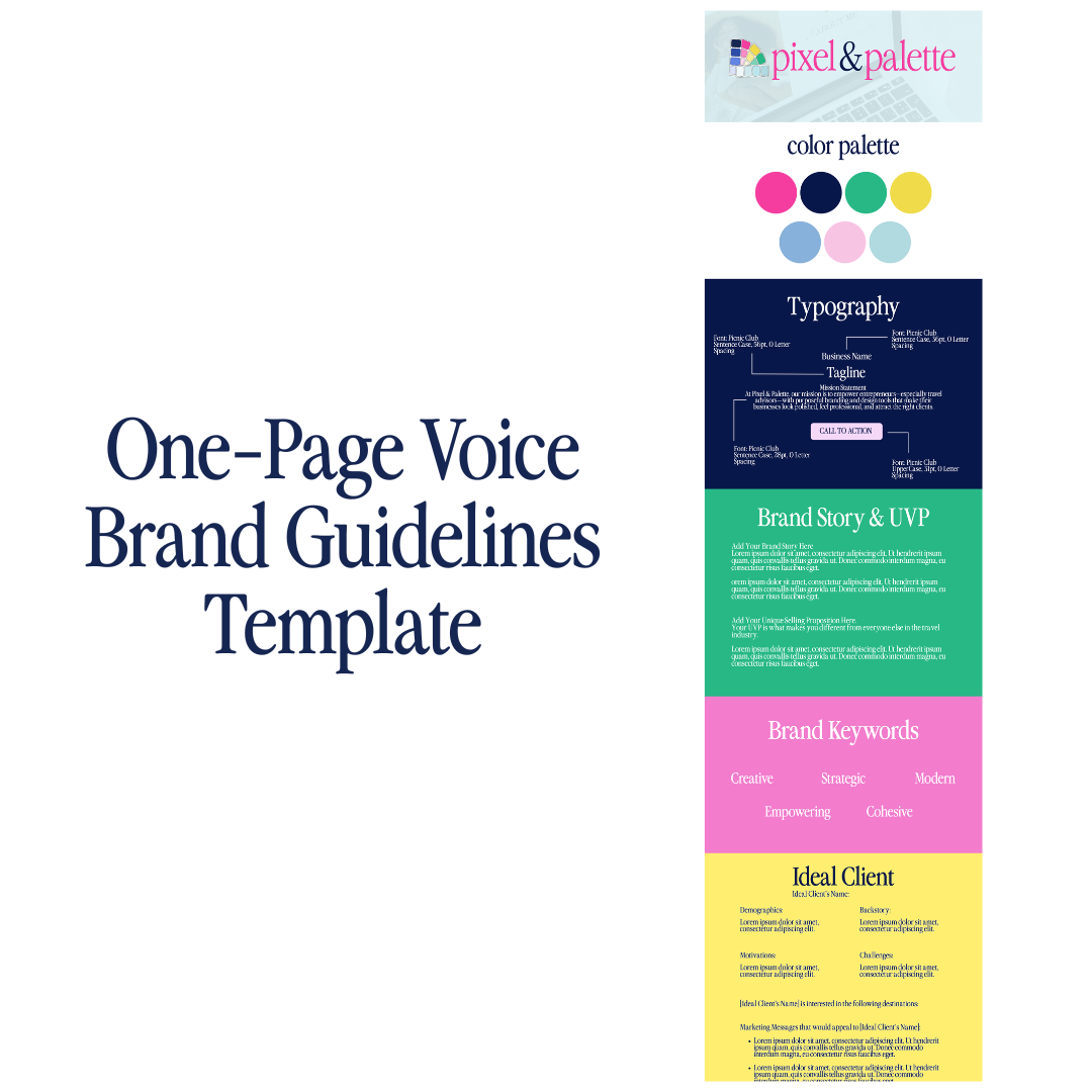 Your brand is more than just visuals — it’s the words you use, the story you tell, and the clients you attract. This Canva template helps you define your brand voice, unique value proposition, keywords, and ideal client profile so your messaging feels clear and consistent.