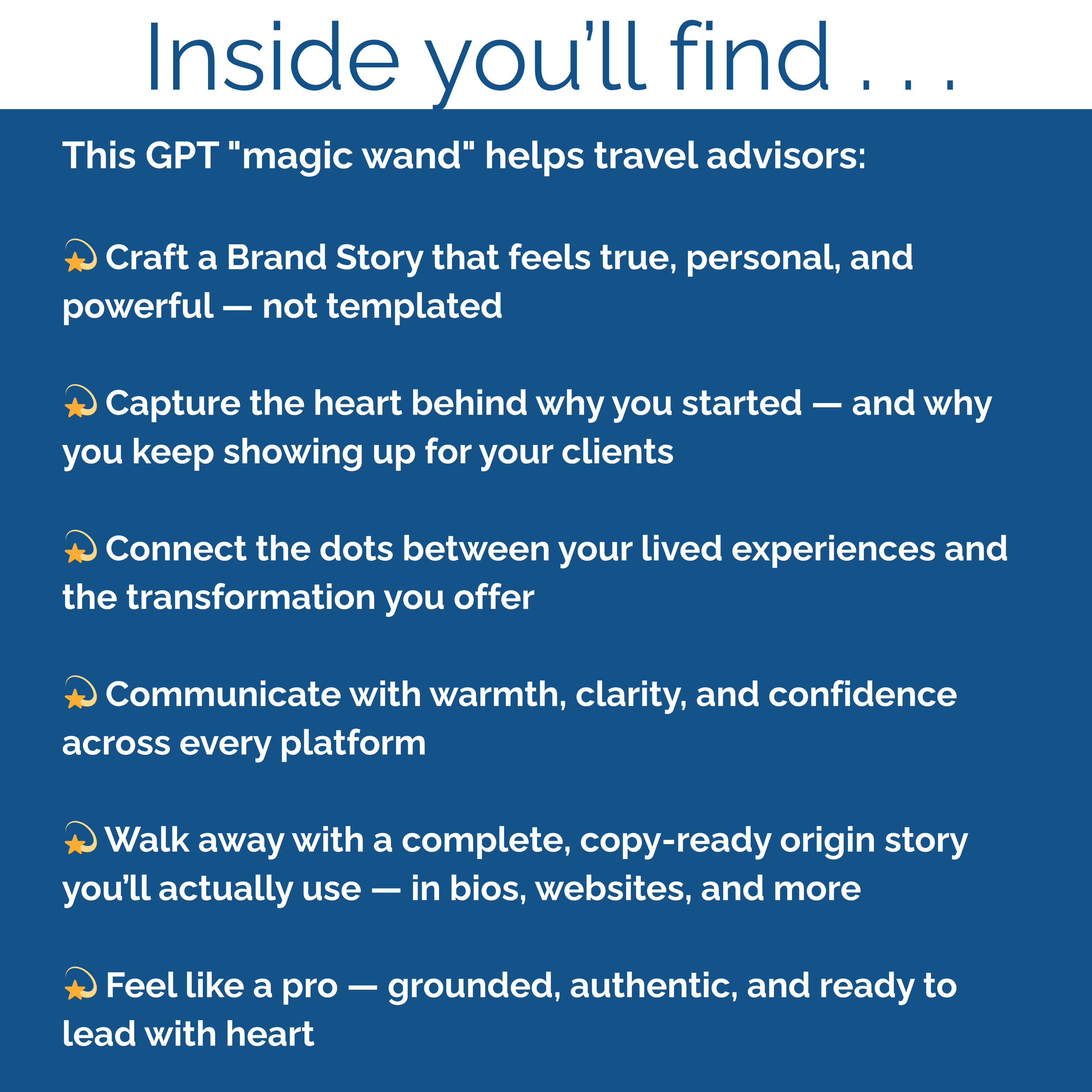 In just minutes, this Magic Wand helps you uncover the story behind your business — transforming your experiences, values, and purpose into a message that resonates deeply with your audience.